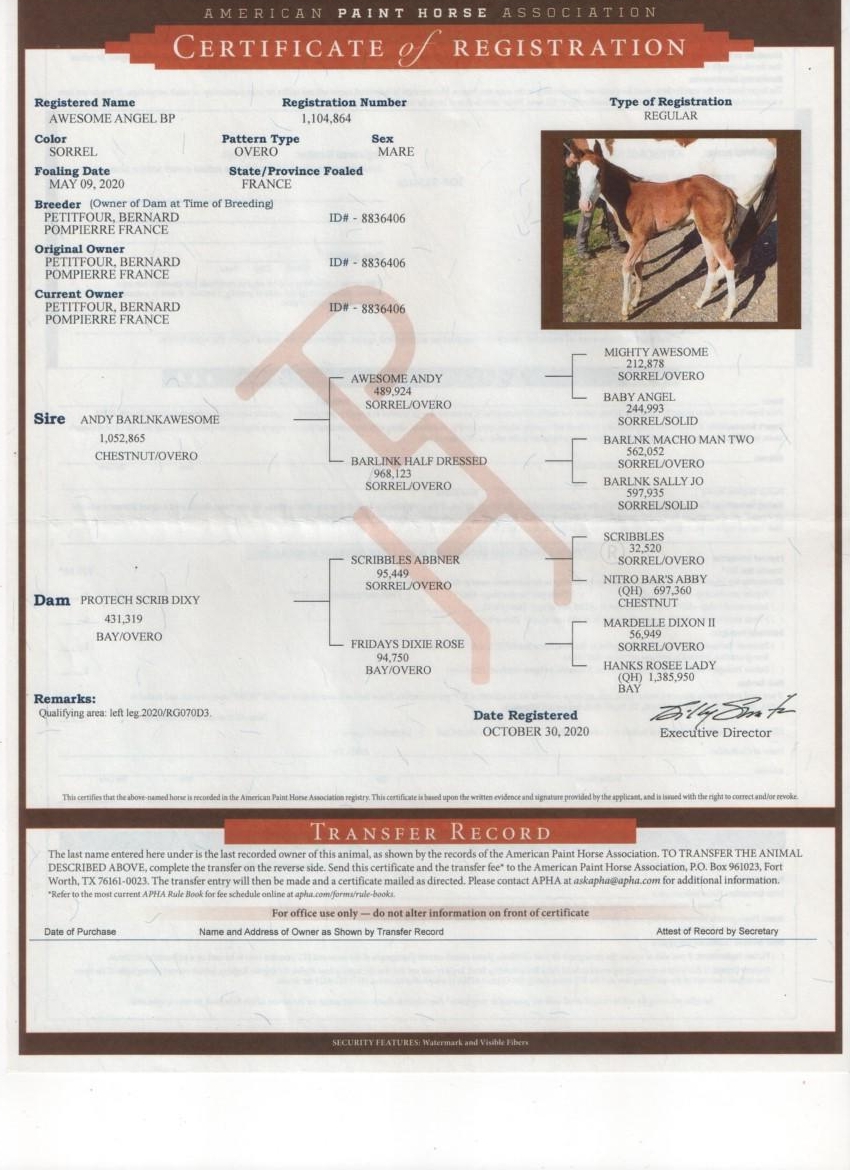"Awesome Angel Bp" née le 09/05/2020 splash overo. LWO négatif. Gestante de "Ec kash royal lynx" pour poulain au alentour du 01 Avril 2026.