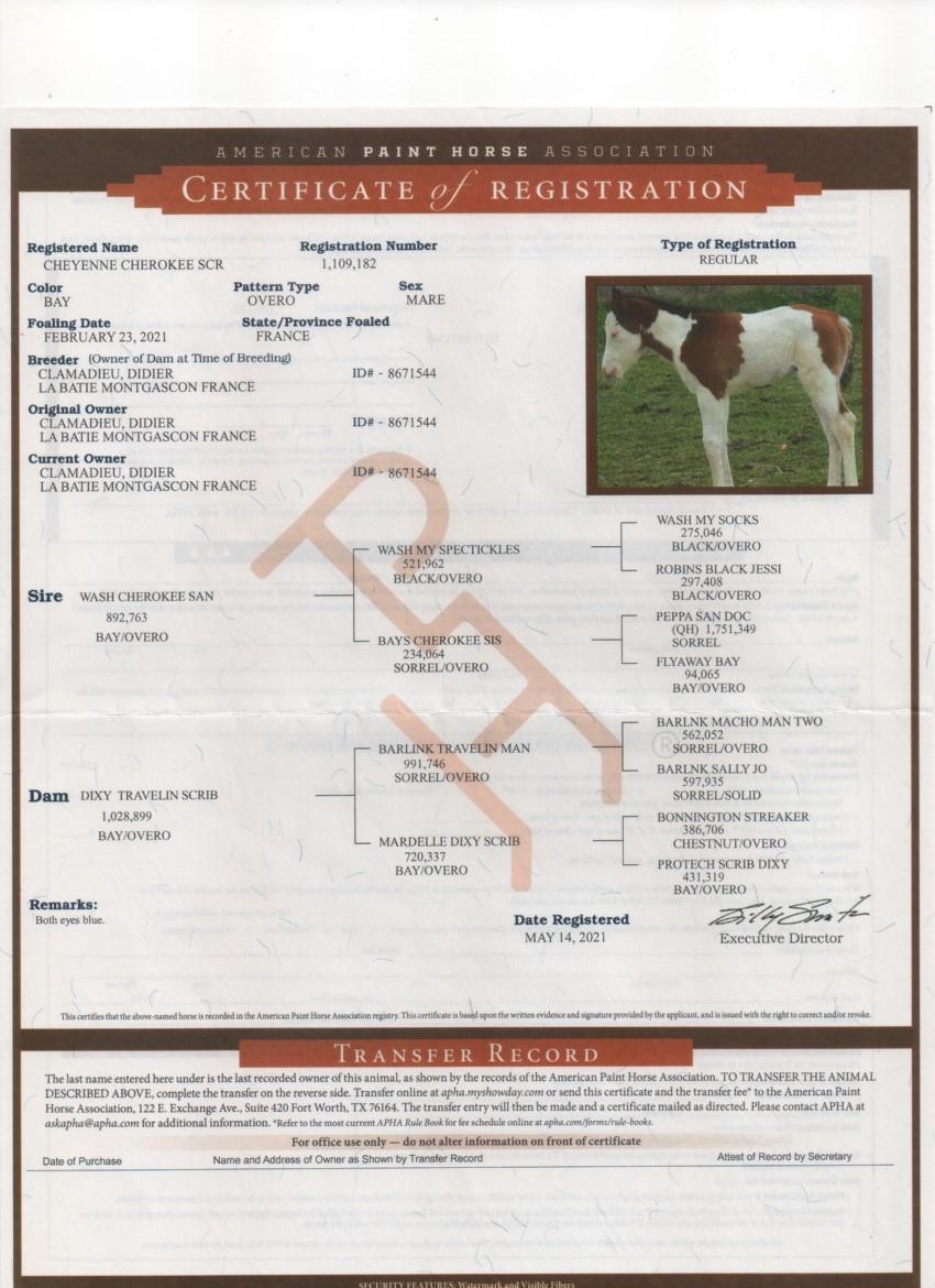 "Cheyenne Cherokee Scr" pleine de  "Loyd" pour poulain aux alentour du 28 Février 2026.  AA,EE,nd1/nd2,prl/n,W20/n,LWO/n,SW1/SW1.